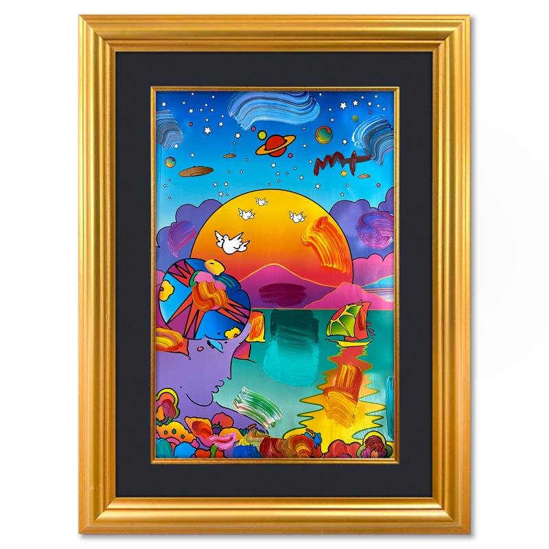 "New Horizon" is a one-of-a-kind mixed media on paper, hand signed by Peter Max. The piece comes custom framed with a backside cutout to display Peter Max Studio registration number 250340 certifying authenticity. Measures approximately 48" x 36" (frame), 36" x 24" (image). This item requires special handling and may have a longer than usual turnaround.