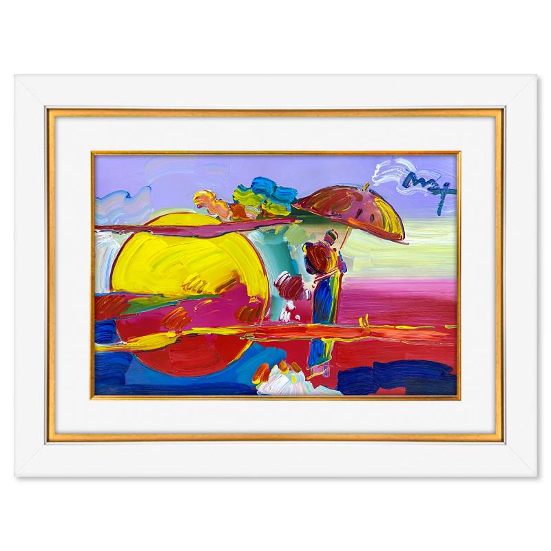 "New Moon 2" is a one-of-a-kind mixed media on paper, hand signed by Peter Max. The piece comes custom framed with a backside cutout to display Peter Max Studio registration number 288579 certifying authenticity. Measures approximately 36" x 48" (frame), 24" x 36" (image).