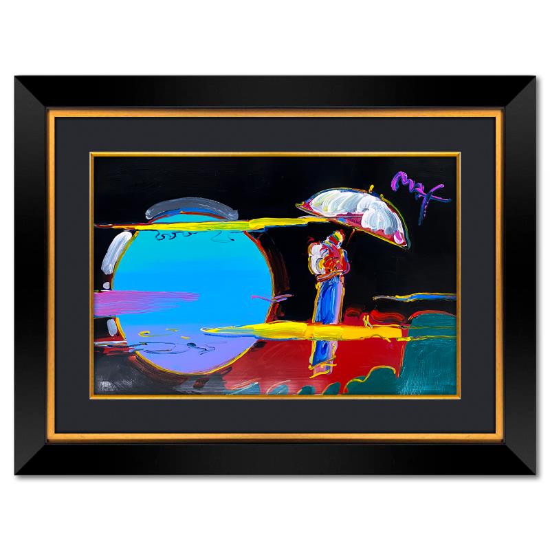 "New Moon 2" is a one-of-a-kind mixed media on paper, hand signed by Peter Max. The piece comes custom framed with a backside cutout to display Peter Max Studio registration number 274662 certifying authenticity. Measures approximately 48" x 36" (frame), 24" x 36" (image). This item requires special handling and may have a longer than usual turnaround.