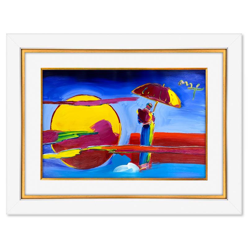 "New Moon 2" is a one-of-a-kind mixed media on paper, hand signed by Peter Max. The piece comes custom framed with a backside cutout to display Peter Max Studio registration number 288764 certifying authenticity. Measures approximately 36" x 48" (frame), 24" x 36" (image). This item requires special handling and may have a longer than usual turnaround.