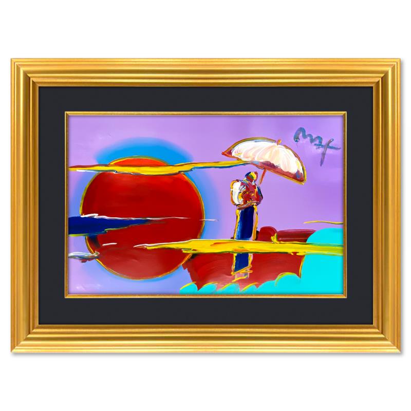 "New Moon 2" is a one-of-a-kind mixed media on paper, hand signed by Peter Max. The piece comes custom framed with a backside cutout to display Peter Max Studio registration number 274656 certifying authenticity. Measures approximately 36" x 48" (frame), 24" x 36" (image). This item requires special handling and may have a longer than usual turnaround.