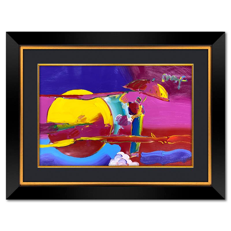 "New Moon 2" is a one-of-a-kind mixed media on paper, hand signed by Peter Max. The piece comes custom framed with a backside cutout to display Peter Max Studio registration number 290160 certifying authenticity. Measures approximately 48" x 36" (frame), 24" x 36" (image). This item requires special handling and may have a longer than usual turnaround.