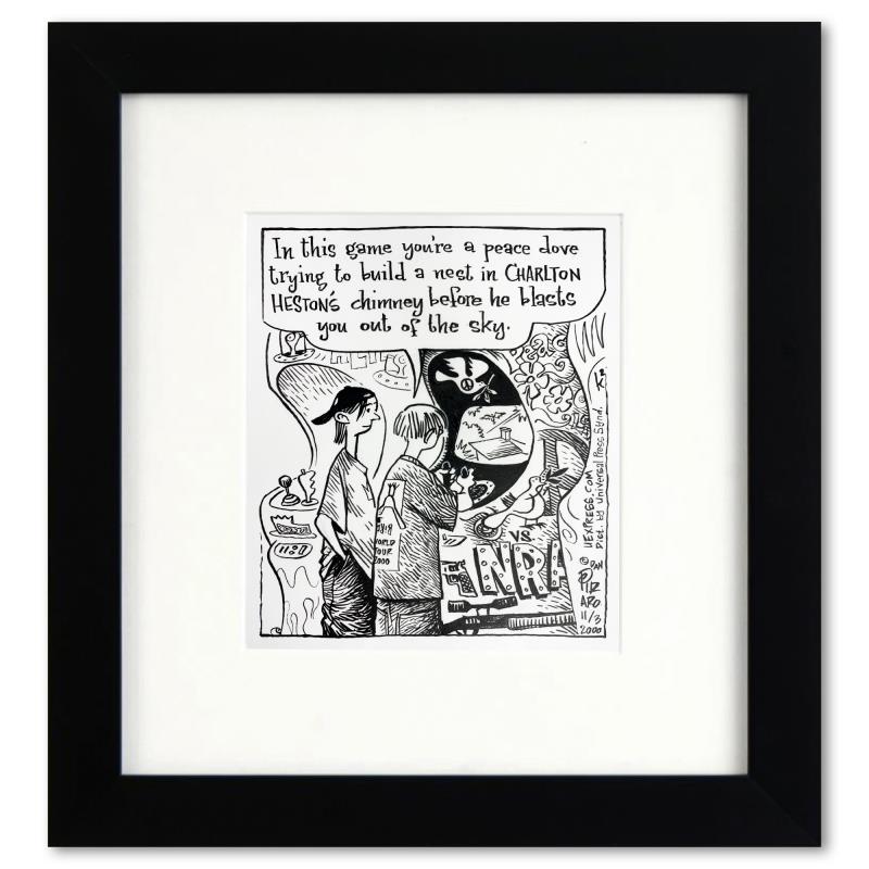 Enter a surreal and satirical world of twisted imagination and award winning creativity. "NRA Arcade" is an original pen & ink drawing on paper by Dan Piraro, creator of the critically acclaimed and award winning comic strip, Bizarro. This piece is hand signed, comes custom framed and includes a letter of authenticity. Measures approximately 12" x 11" (frame), 7" x 6" (image). This item requires special handling and may have a longer than usual turnaround.