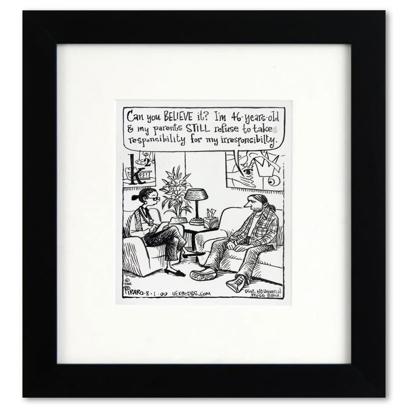 Enter a surreal and satirical world of twisted imagination and award winning creativity. "Parental Responsibility" is an original pen & ink drawing on paper by Dan Piraro, creator of the critically acclaimed and award winning comic strip, Bizarro. This piece is hand signed, comes custom framed and includes a letter of authenticity. Measures approximately 12" x 11" (frame), 6.5" x 5.5" (image). This item requires special handling and may have a longer than usual turnaround.