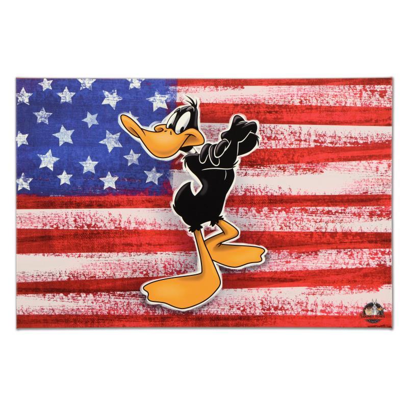 "Patriotic Series: Daffy Duck" is a limited edition giclee on gallery wrapped canvas by Looney Tunes. This piece comes from an edition of 250 and bears an imprint of Looney Tunes' official seal. Includes Certificate of Authenticity. Measures approx. 30" x 20" (image) This item requires special handling and may have a longer than usual turnaround.
