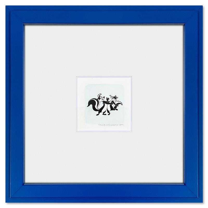 "Pepe Le Pew & Penelope Pussycat" is a limited edition etching on paper with hand tinted coloring from Warner Bros., numbered and dated 1999. This piece comes framed. Measures approx. 9" x 9" (frame), 1" x 1.5" (image).