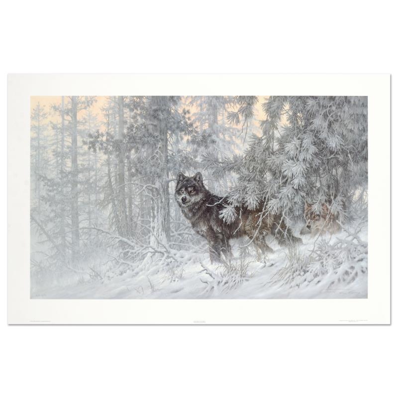 "Phantom of the North - Wolf" is a limited edition lithograph on paper by Larry Fanning (1938-2014), numbered and hand signed with a Letter of Authenticity. Measures approximately 32.5" x 19.5" (image).