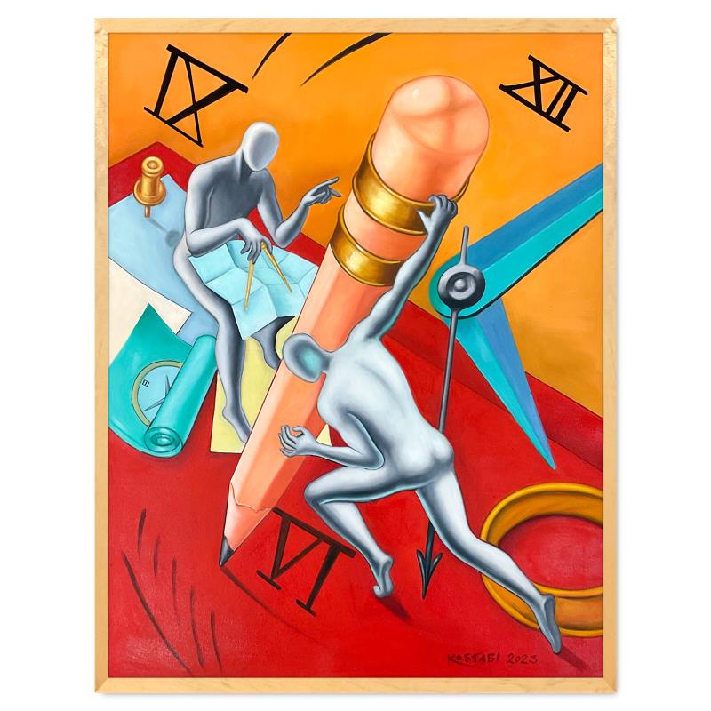"Planning The Revolution" is an original painting on canvas by Mark Kostabi, hand signed by the artist. This piece comes custom framed. Includes Certificate of Authenticity. Measures approx. 38" x 50" (frame), 36" x 48" (image). This item requires special handling and may have a longer than usual turnaround.