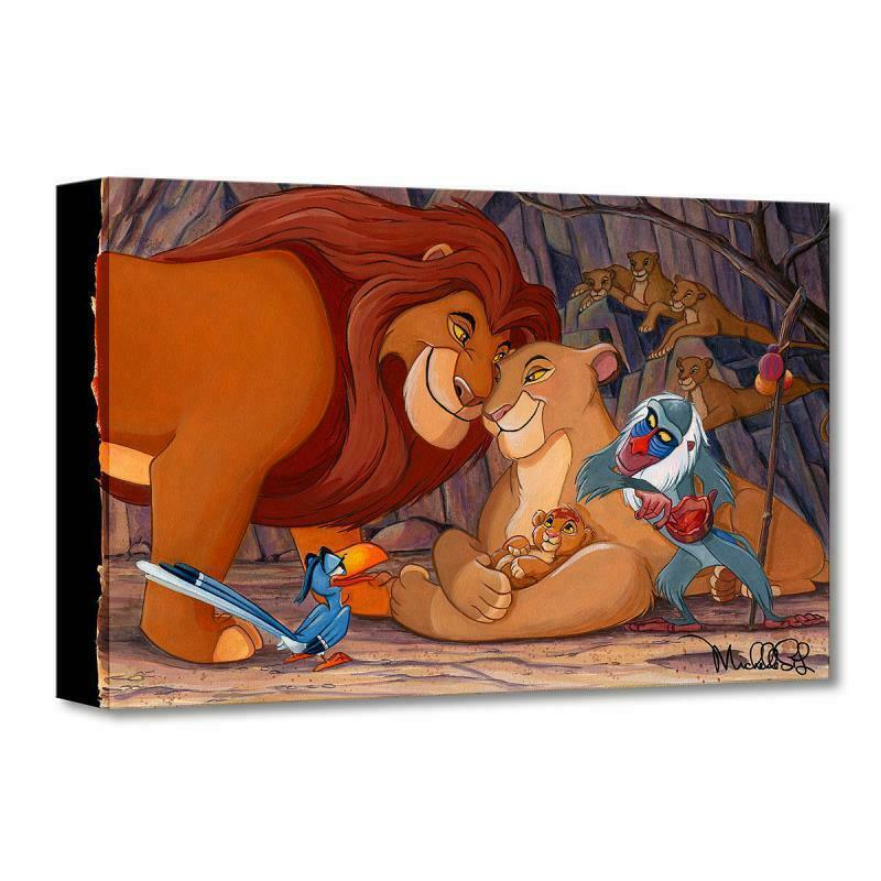 "Prince of the Pride " is a limited edition giclee on canvas by Michelle St. Laurent. Part of the Disney Treasures collection from Disney Fine Art, this limited edition featuring Lion King imagery comes gallery wrapped and ready to hang. It is also accompanied by a certificate of authenticity. The edition is limited to 1500 pieces. Item measures approximately 12" x 18".
