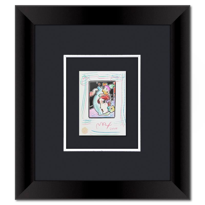 "Profile with Vase" is a one-of-a-kind mixed media on paper, hand signed by Peter Max. The piece comes custom framed with a backside cutout to display Peter Max Studio registration number 338823 certifying authenticity. Measures approximately 22.5" x 20" (frame), 8.5" x 6" (image). This item requires special handling and may have a longer than usual turnaround.