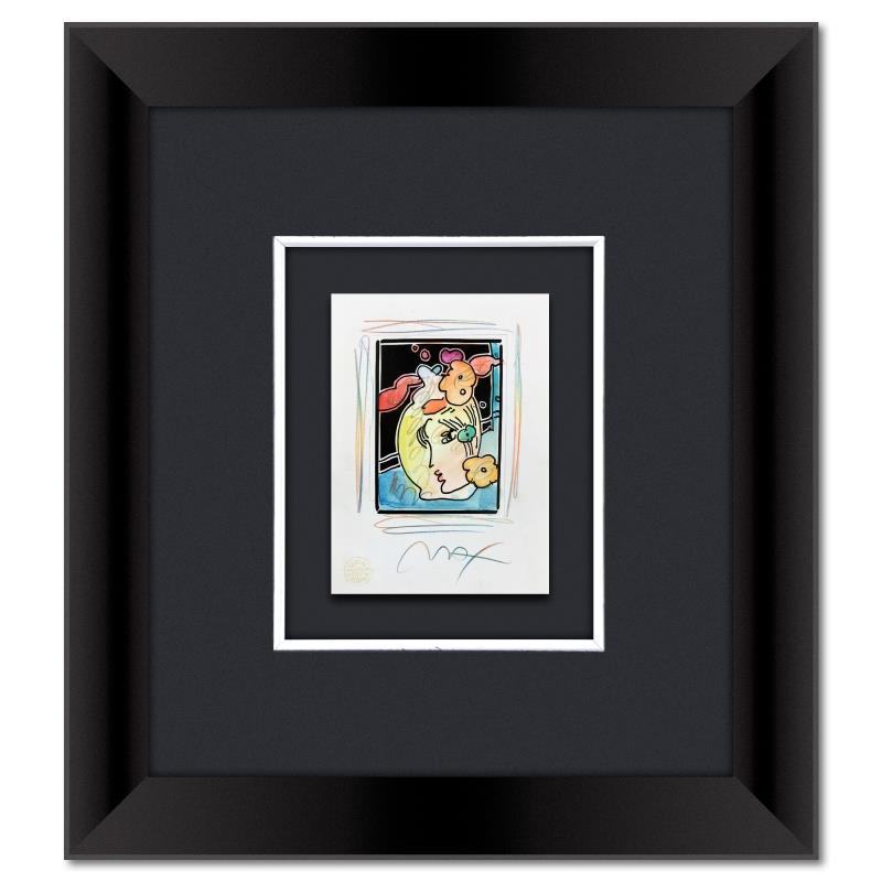 "Profile with Vase" is a one-of-a-kind mixed media on paper, hand signed by Peter Max. The piece comes custom framed with a backside cutout to display Peter Max Studio registration number 371581 certifying authenticity. Measures approx. 22.5" x 21.5" (frame), 8" x 6" (image). This item requires special handling and may have a longer than usual turnaround.