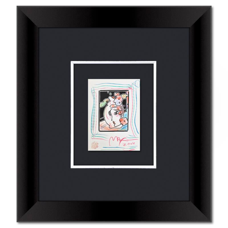 "Profile with Vase" is a one-of-a-kind mixed media on paper, hand signed by Peter Max. The piece comes custom framed with a backside cutout to display Peter Max Studio registration number 338819 certifying authenticity. Measures approximately 22.5" x 20" (frame), 8.5" x 6" (image). This item requires special handling and may have a longer than usual turnaround.