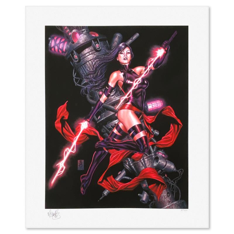 "Psylocke" is a limited edition giclee on paper from Marvel Comics and Mark Brooks, PP numbered 3/4 and bearing the authorized signature of the artist. Includes Letter of Authenticity. Measures approx. 24" x 18" (border) 20" x 14" (image).