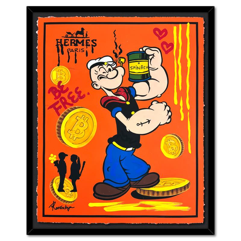"Pumped Coin" is a one-of-a-kind mixed media on deckle edge paper by Nastya Rovenskaya; hand signed by the artist. This piece comes custom framed and includes letter of authenticity. Measures approximately 36" x 30" (framed), 30" x 24" (image).