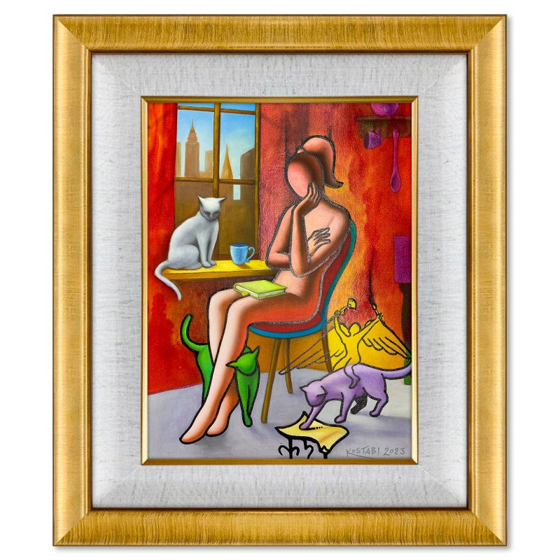 "Quiet Company" is an original oil painting on canvas by Mark Kostabi, hand signed by the artist. This piece comes custom framed. Includes Certificate of Authenticity. Measures approx. 33.5" x 27.5" (frame), 23.5" x 17.5" (image).