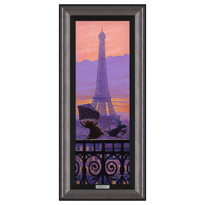 "Race to the Kitchen" is a framed limited edition giclee on canvas by Tim Rogerson. Part of the Disney Fine Art Silver Series, and featuring Ratatouille imagery, this piece comes framed and ready to hang. It is accompanied by a Certificate of Authenticity from Disney Fine Art. The edition is limited to just 500 pieces and measures approximately 35" x "15 (framed), 30" x 10" (image). This piece requires special handling and may have a longer than normal turnaround.