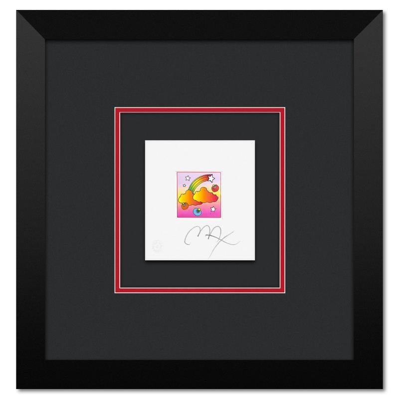 "Rainbow with Clouds" is a limited edition lithograph on paper by Peter Max, numbered and hand signed by the artist. This piece comes framed. Includes Certificate of Authenticity from Peter Max Studios. Measures approx. 14" x 13.5" (frame), 5" x 4.5" (image). This item requires special handling and may have a longer than usual turnaround.