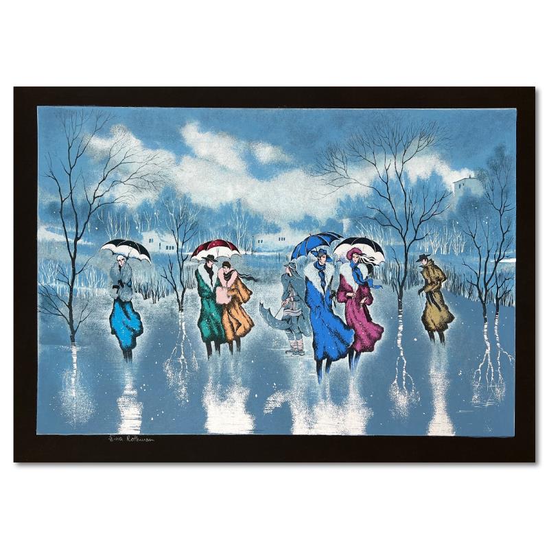 "Rainy Day" is a limited edition serigraph on paper by Zina Roitman. The piece comes hand signed by the artist, numbered, and with a letter of authenticity. Measures approximately 18" x 27".