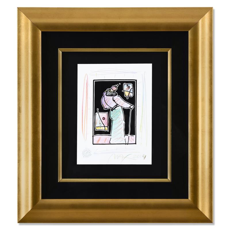 "Sage with Cane II" is a one-of-a-kind mixed media on paper, hand signed by Peter Max. Includes Certificate of Authenticity from Peter Max Studios. This piece comes custom framed. Measures approx. 16.5" x 18.5" (with frame), 7" x 9" (image).
