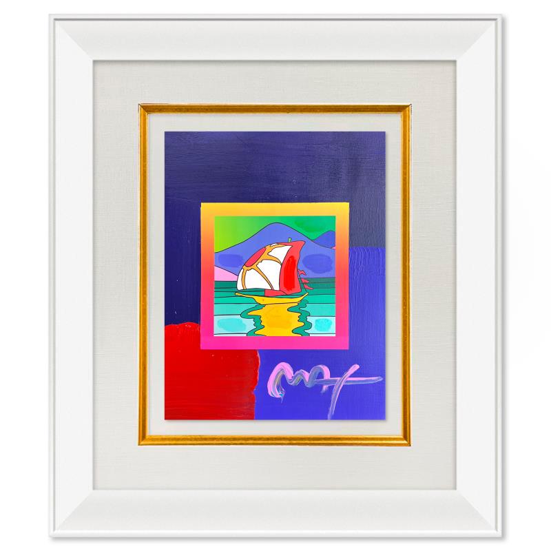 "Sailboat East" is a hand signed one-of-a-kind acrylic mixed media on paper by Peter Max. The piece comes custom framed with a backside cutout to display Peter Max Studio registration number 258521 certifying authenticity. Measures approximately 30" x 26" (frame), 17" x 13" (image). This item requires special handling and may have a longer than usual turnaround.
