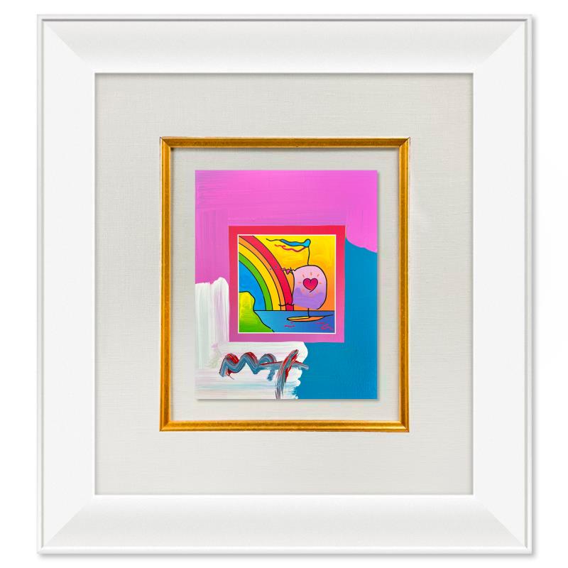 "Sailboat with Heart" is a one-of-a-kind acrylic mixed media on paper, hand signed by Peter Max. The piece comes custom framed with a backside cutout to display Peter Max Studio registration number 328821 certifying authenticity. Measures approximately 24" x 22" (frame), 10" x 8" (image). This item requires special handling and may have a longer than usual turnaround.
