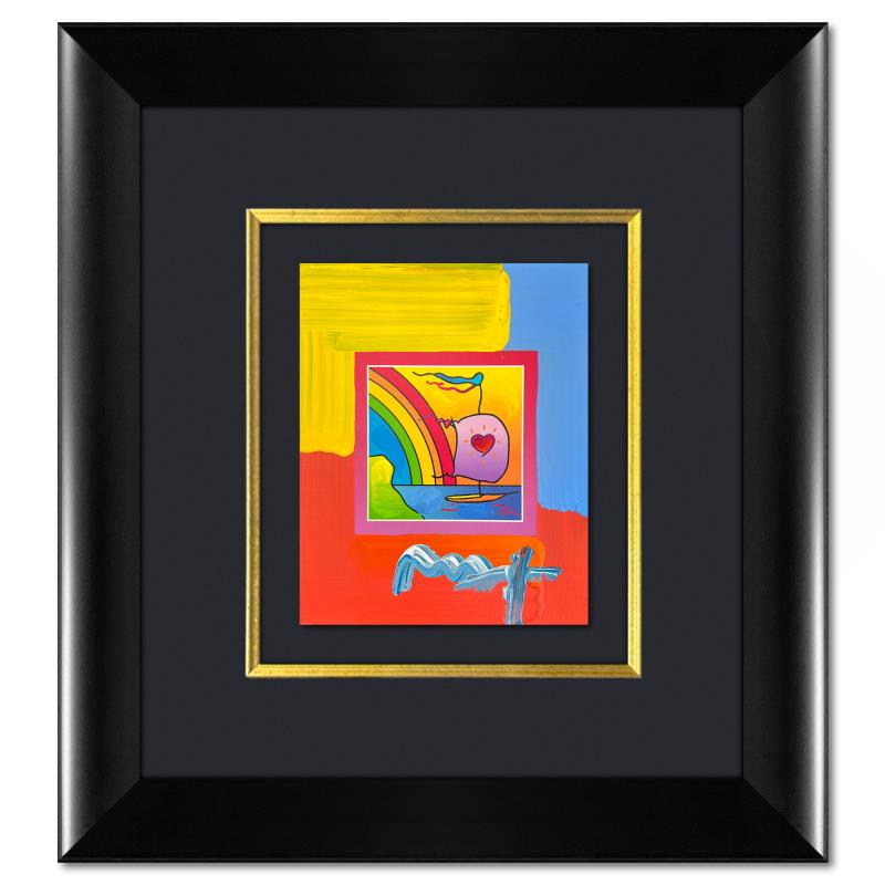 "Sailboat with Heart" is a one-of-a-kind acrylic mixed media on paper, hand signed by Peter Max. The piece comes custom framed with a backside cutout to display Peter Max Studio registration number 328815 certifying authenticity. Measures approximately 24" x 22" (frame), 10" x 8" (image). This item requires special handling and may have a longer than usual turnaround.
