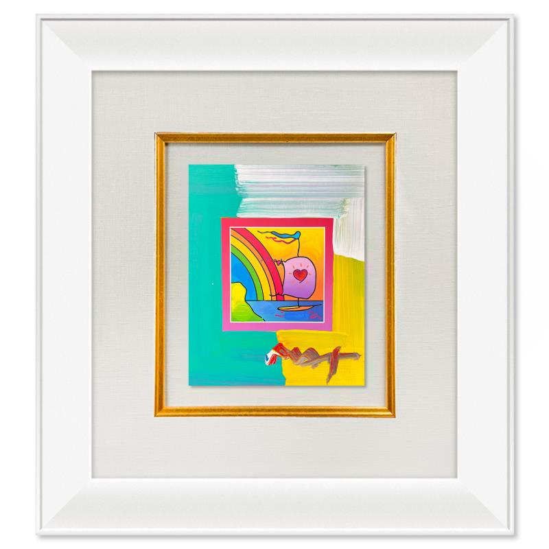 "Sailboat with Heart" is a one-of-a-kind acrylic mixed media on paper, hand signed by Peter Max. The piece comes custom framed with a backside cutout to display Peter Max Studio registration number 328816 certifying authenticity. Measures approximately 24" x 22" (frame), 10" x 8" (image). This item requires special handling and may have a longer than usual turnaround.