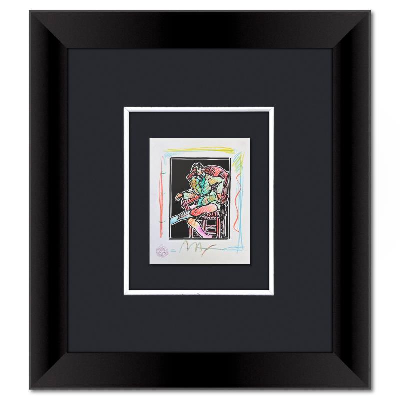 "Seated Figure" is a one-of-a-kind mixed media on paper, hand signed by Peter Max. The piece comes custom framed with a backside cutout to display Peter Max Studio registration number 340031 certifying authenticity. Measures approximately 23" x 21" (frame), 9" x 7" (image). This item requires special handling and may have a longer than usual turnaround.