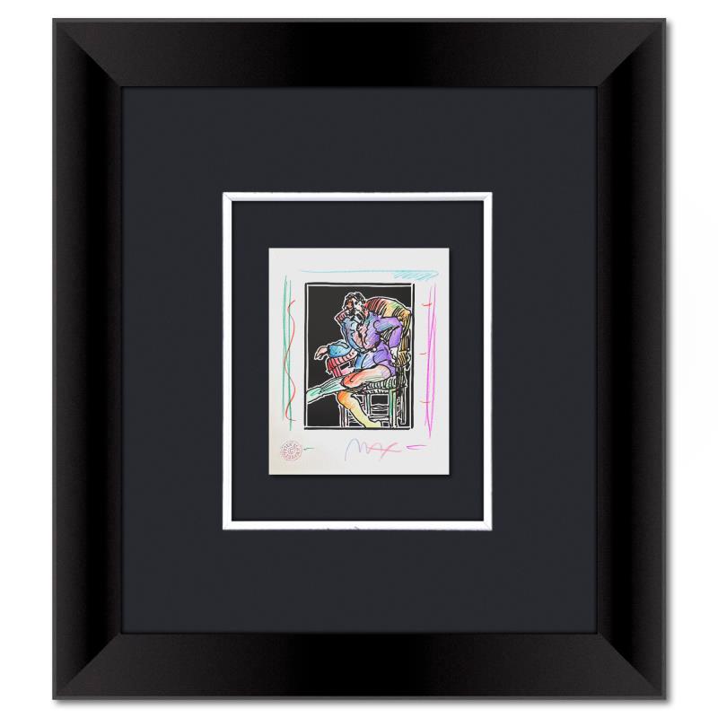 "Seated Figure" is a one-of-a-kind mixed media on paper, hand signed by Peter Max. The piece comes custom framed with a backside cutout to display Peter Max Studio registration number 340033 certifying authenticity. Measures approximately 23" x 21" (frame), 9" x 7" (image). This item requires special handling and may have a longer than usual turnaround.