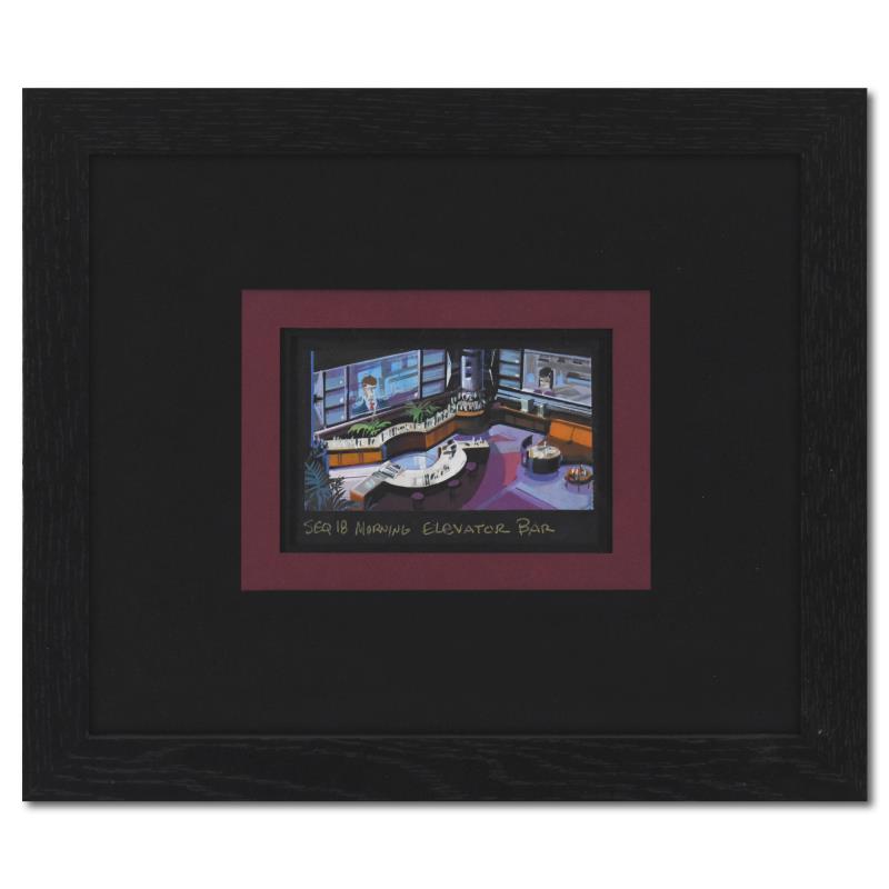 "Seq 18 Morning Elevator Bar" is an original story board production painting on paper from the Marvel animated series Avengers: Earth's Mightiest Heroes. This piece comes framed and includes Letter of Authenticity. Measures approx. 12.5" x 10.5" (frame), 5" x 4" (image).