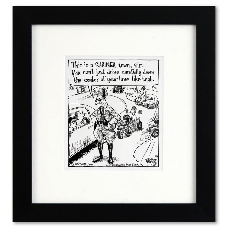 Enter a surreal and satirical world of twisted imagination and award winning creativity. "Shriner Town" is an original pen & ink drawing on paper by Dan Piraro, creator of the critically acclaimed and award winning comic strip, Bizarro. This piece is hand signed, comes custom framed and includes a letter of authenticity. Measures approximately 12" x 11" (frame), 7" x 6" (image). This item requires special handling and may have a longer than usual turnaround.