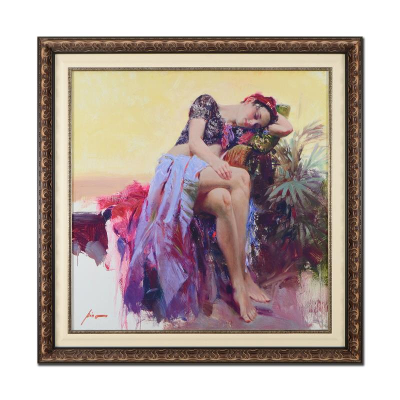 Pino's portraits allow glimpses into intensely personal, intimate spaces, conveying emotion through rich, warm color and sensual brushwork. "Siesta" is a hand embellished limited edition giclee on canvas by Pino (1939-2010). The piece is numbered, hand signed, custom framed, and includes certificate of authenticity. Measures approx. 43.5" x 43.5" (frame), 34" x 34" (image). This item requires special handling and may have a longer than usual turnaround.