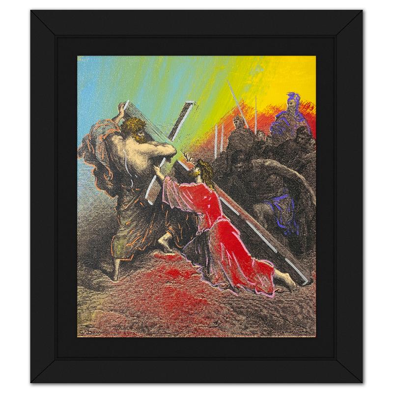 Steve Kaufman (1960-2010), "Simon Helping Jesus" Framed Hand Embellished Limited Edition Silscreen, Numbered 19/50 Inverso and Hand Signed with Letter of Authenticity