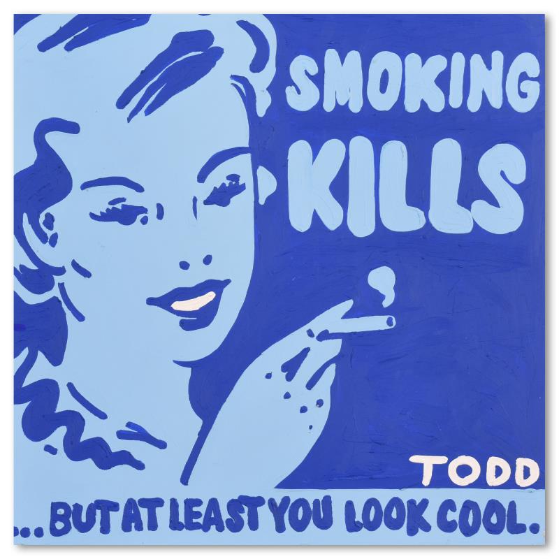 "Smoking Kills" is an original acrylic painting on gallery wrapped canvas by Todd Goldman, hand signed by the artist. Includes Letter of Authenticity. Measures approx. 30" x 30" (image). Due to the way this piece was stored there may be minor wear or signs of age (such as wear on the corners) but the piece is in overall good condition.