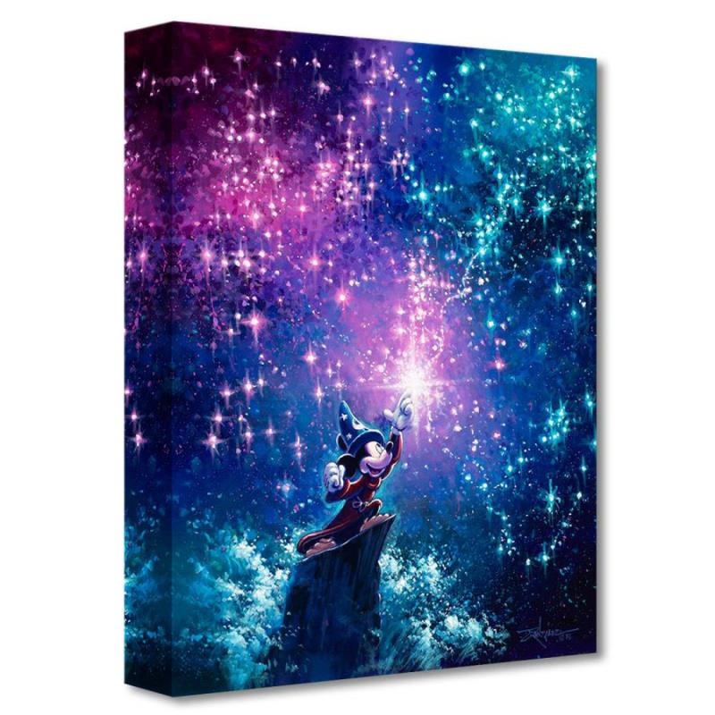"Sorcerer Mickey" is a limited edition giclee on canvas by Rodel Gonzalez. Part of the Disney Treasures collection from Disney Fine Art, this limited edition featuring Sorcerer Mickey imagery comes gallery wrapped and ready to hang. It is also accompanied by a certificate of authenticity. The edition is limited to 1500 pieces. Item measures approximately 16" x 12".