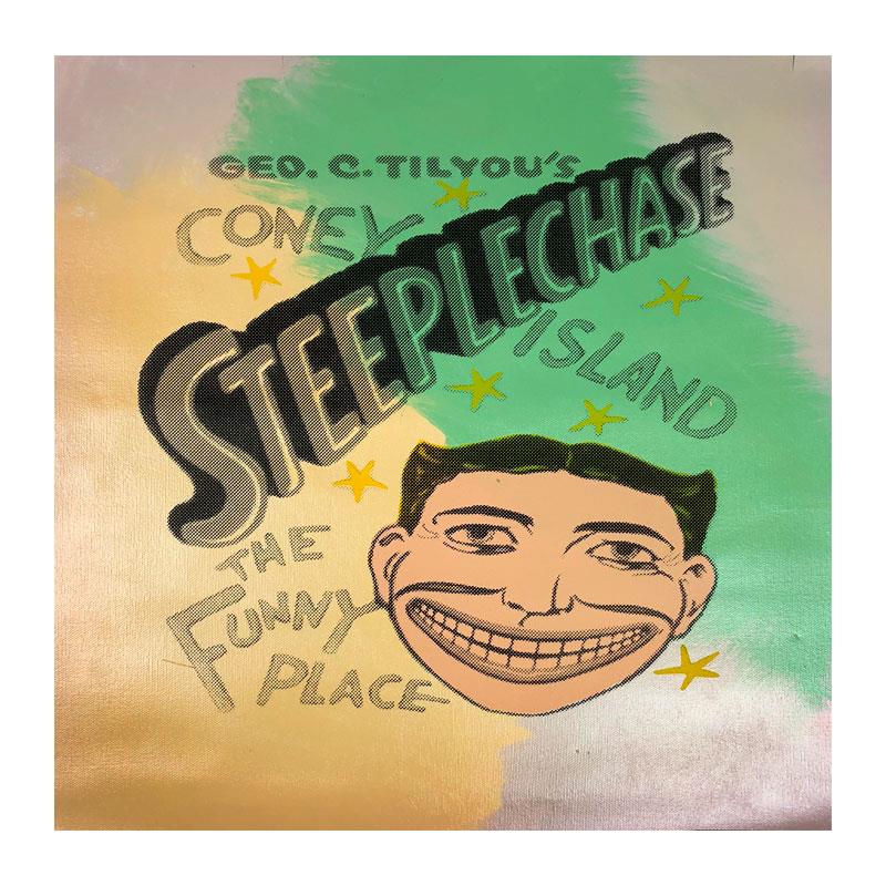 "Steepechase, Coney Island" is a limited edition hand pulled silkscreen mixed media on canvas by Andy Warhol protege Steve Kaufman (1960-2010). This piece is numbered and 47/50 and hand signed inverso. Includes letter of authenticity. As is common with Kaufman's works, this piece may have perceived minor flaws, but is in overall good condition. Measures approximately 17" x 17" (image).