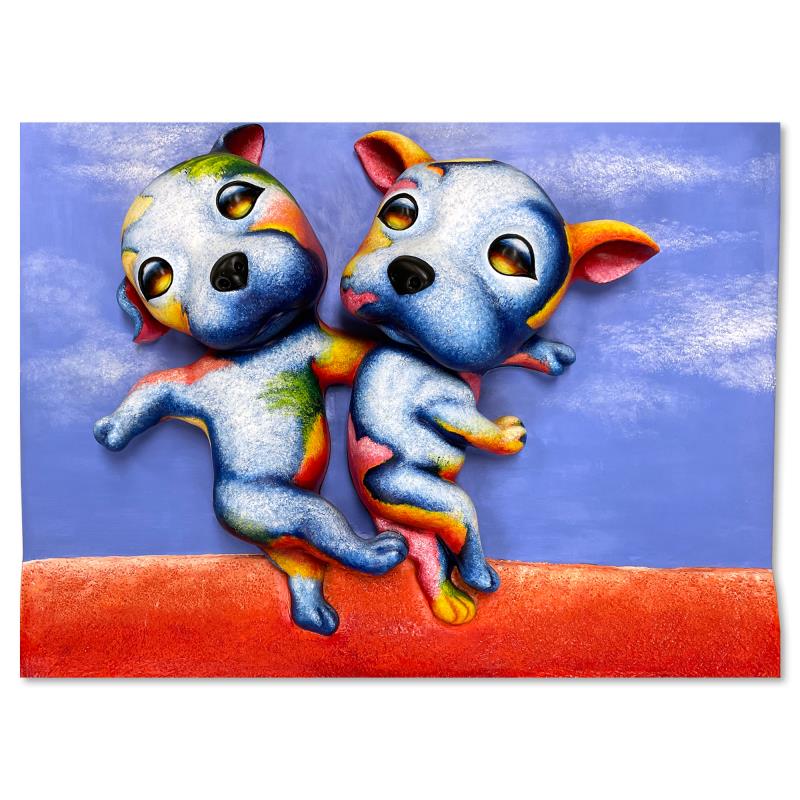 "Step" is a hand painted limited edition dimensional bas relief sculpture by Wang. This piece is numbered 3/3 and hand signed inverso. Includes Letter of Authenticity. Measures approx. 24" x 32" x 8". There are minor hairline cracks on the top and side panels.