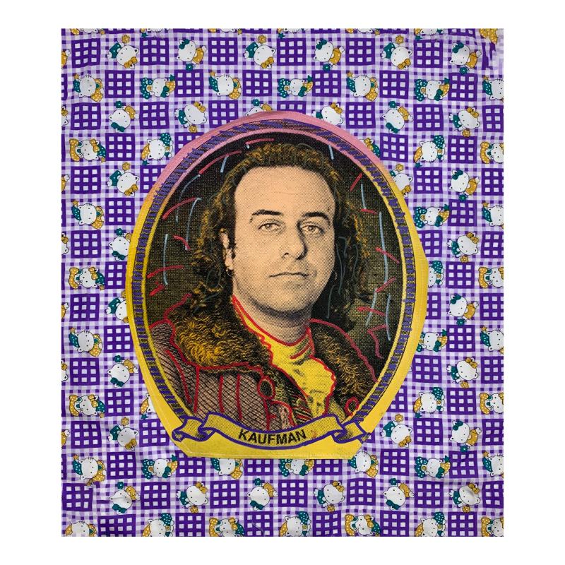 "Steve Kaufman" is limited edition hand pulled silkscreen unique mixed media on canvas and textile by Andy Warhol protege Steve Kaufman (1960-2010). This piece is numbered and hand signed inverso and includes a letter of authenticity. As is common with Kaufman's works, this piece may have perceived minor flaws, but is in overall good condition. Measures approximately 26" x 22" before cropping.