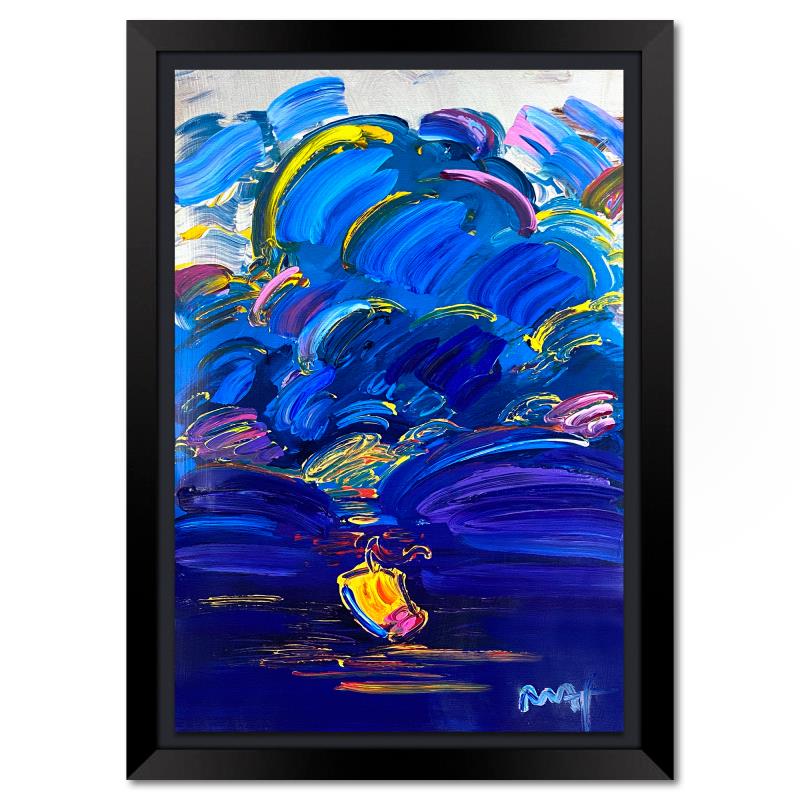 "Summer Storm" is a one-of-a-kind mixed media on paper, hand signed by Peter Max. The piece comes custom framed with a backside cutout to display Peter Max Studio registration number 283474 certifying authenticity. Measures approximately 42" x 30" (frame), 36" x 24" (image). This item requires special handling and may have a longer than usual turnaround.