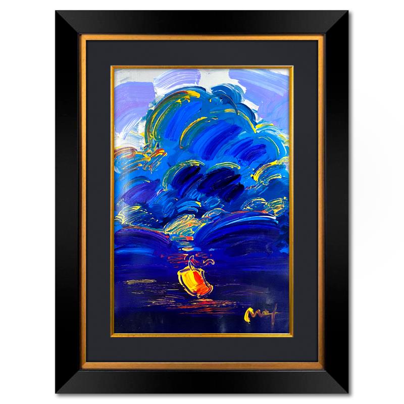 "Summer Storm" is a one-of-a-kind mixed media on paper, hand signed by Peter Max. The piece comes custom framed with a backside cutout to display Peter Max Studio registration number 286920 certifying authenticity. Measures approximately 48" x 36" (frame), 36" x 24" (image). This item requires special handling and may have a longer than usual turnaround.