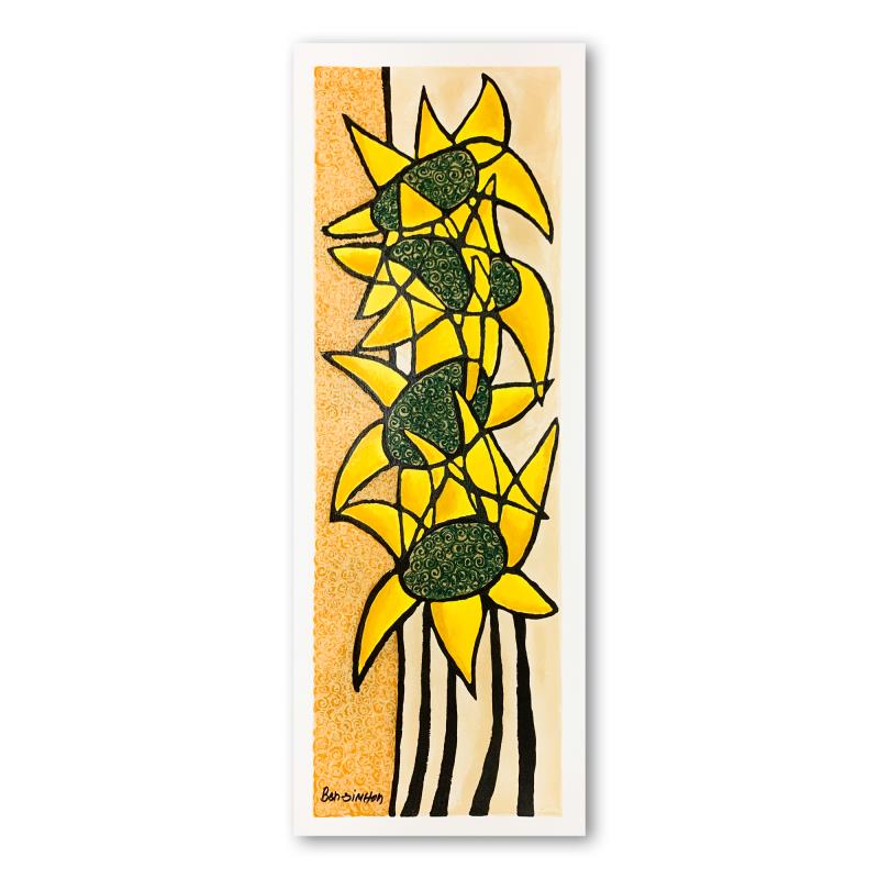 "Sunflower Trio" is a limited edition serigraph on paper by Ben Simhon. It is numbered and hand signed and includes a letter of authenticity. Measures approximately 8.5" x 26.5" (image).
