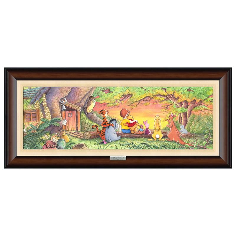 "Sunset in the Woods" is a framed limited edition giclee on canvas by Michelle St.Laurent. Part of the Disney Fine Art Silver Series, and featuring Winnie the Pooh imagery, this piece comes framed and ready to hang. It is accompanied by a Certificate of Authenticity from Disney Fine Art. The edition is limited to just 500 pieces and measures approximately 14.25" X 34.25" (framed).