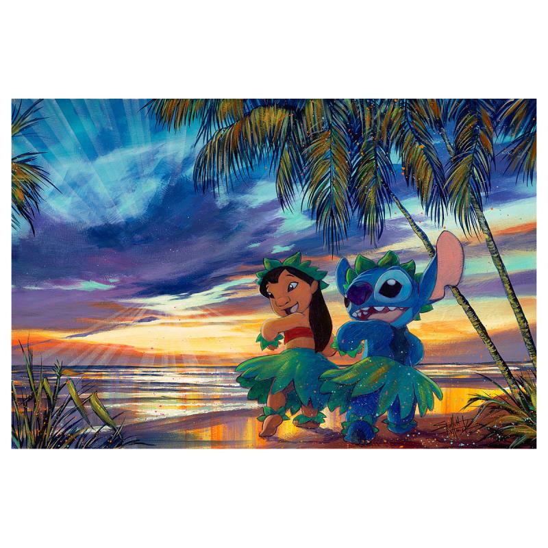 "Sunset Salsa" is a hand embellished limited edition giclee on canvas by Stephen Fishwick from Disney Fine Art. Featuring Lilo & Stitch imagery, this piece comes numbered, hand signed by the artist, and with a Certificate of Authenticity. Measures approximately 20" x 30" (image).