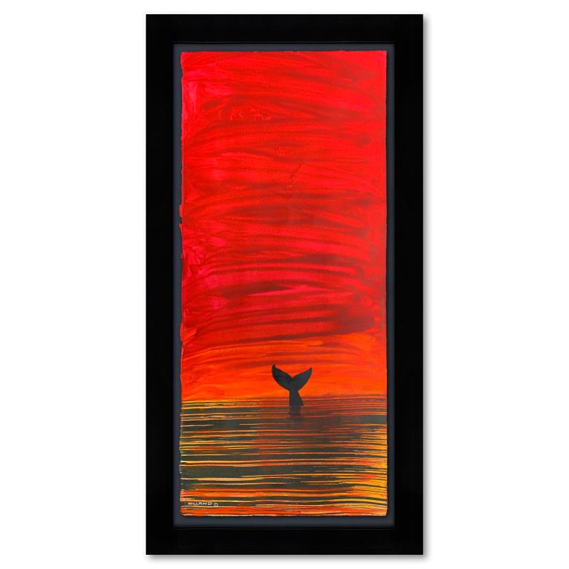 "Sunset Whale" is an original painting acrylic on deckle edge paper by Wyland. Hand signed by the artist, the piece comes custom framed and with a letter of authenticity. Measures approximately 26.5" x 14.5" (framed), 22.5" x 10.5" (image). This item requires special handling and may have a longer than usual turnaround.
