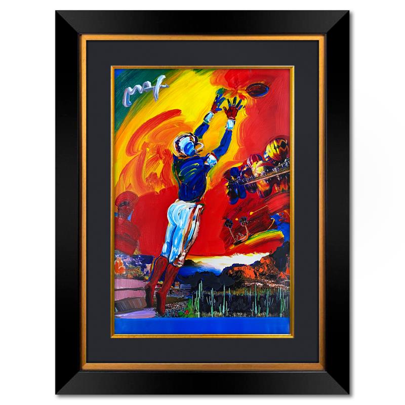 "Superbowl XXX" is a one-of-a-kind mixed media on paper, hand signed by Peter Max. The piece comes custom framed with a backside cutout to display Peter Max Studio registration number 306644 certifying authenticity. Measures approximately 48" x 36" (frame), 36" x 24" (image). This item requires special handling and may have a longer than usual turnaround.