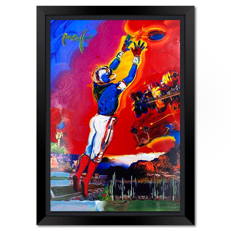 "Superbowl XXX" is a one-of-a-kind mixed media on paper, hand signed by Peter Max. The piece comes custom framed with a backside cutout to display Peter Max Studio registration number 306258 certifying authenticity. Measures approximately 42" x 30" (frame), 36" x 24" (image). This item requires special handling and may have a longer than usual turnaround.