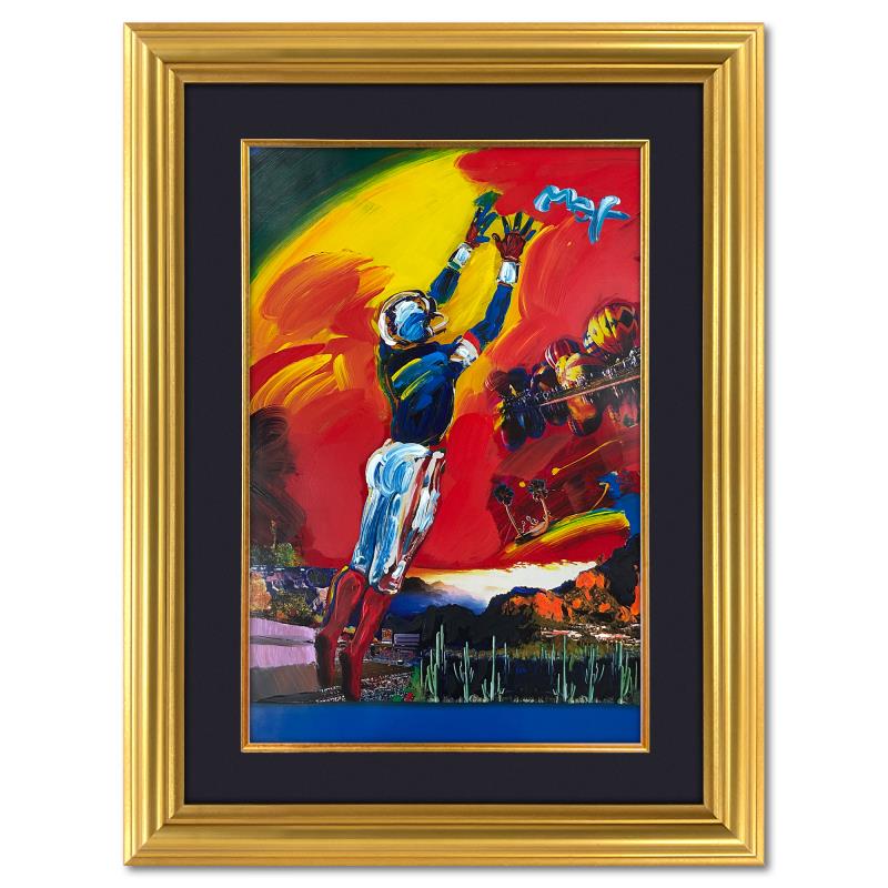 "Superbowl XXX" is a one-of-a-kind acrylic mixed media on paper, hand signed by Peter Max. The piece comes custom framed with a backside cutout to display Peter Max Studio registration number 306641 certifying authenticity. Measures approx. 48.5" x 36.5" (frame), 36" x 24" (image).