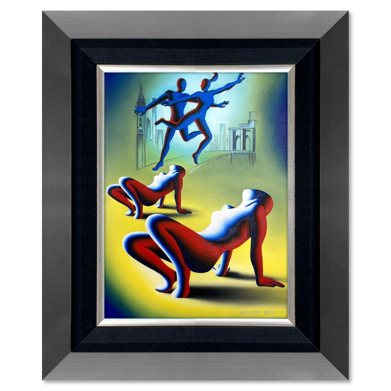 "Take it To the Limit" is an original oil painting on canvas by Mark Kostabi, hand signed by the artist. This piece comes custom framed. Includes Certificate of Authenticity. Measures approx. 33.5" x 27.5" (frame), 23.5" x 17.5" (image).