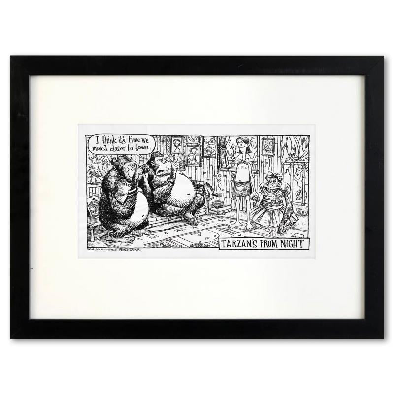 Enter a surreal and satirical world of twisted imagination and award winning creativity. "Tarzan's Prom Night" is an original pen & ink drawing on paper by Dan Piraro, creator of the critically acclaimed and award winning comic strip, Bizarro. This piece is hand signed, comes custom framed and includes a letter of authenticity. Measures approximately 14" x 21" (frame), 7" x 13" (image). This item requires special handling and may have a longer than usual turnaround.