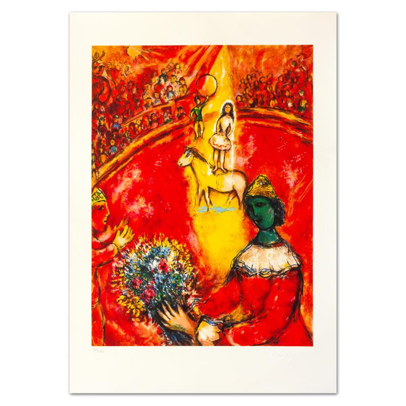 "The Circus" is a limited edition lithograph on paper by Marc Chagall (1887-1985). Printed by Atelier Mourlot in Paris and authorized by the Chagall Estate and ADAGP Paris , the piece is plate signed and comes with a letter of authenticity. Measures approximately 32" x 23.5" (image).